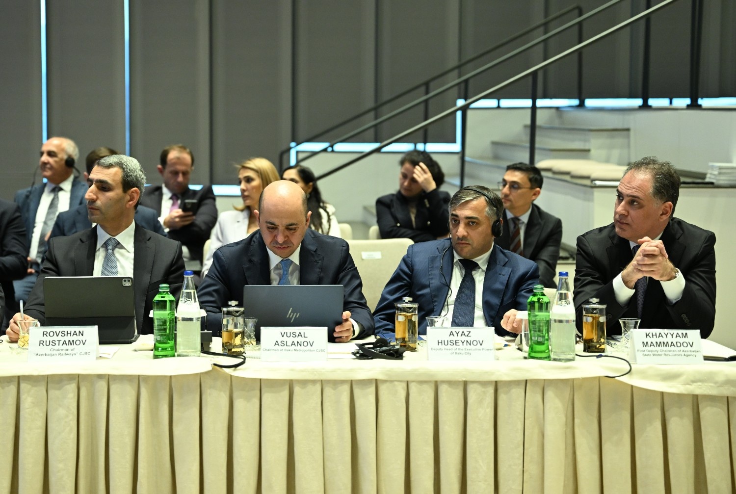 Dəyirmi masa çərçivəsində Bakı şəhər İcra Hakimiyyətinin başçısı Eldar Əzizov, Azərbaycan Dövlət Su Ehtiyatları Agentliyinin (ADSEA) sədri Zaur Mikayılov, Azərbaycan Avtomobil Yolları Dövlət Agentliyinin İdarə Heyətinin sədri Saleh Məmmədov, “Azərbaycan Dəmir Yolları” QSC-nin sədri Rövşən Rüstəmov, “Bakı Metropoliteni” QSC-nin sədri Vüsal Aslanov ölkənin sosial-iqtisadi inkişaf prioritetlərinə uyğun olaraq dayanıqlı inkişaf, şəhərsalma, su ehtiyatlarının idarə edilməsində səmərəliliyin artırılması, nəqliyyat infrastrukturunun modernləşdirilməsi ilə bağlı layihələr barədə məlumat verilblər. Dəyirmi masa çərçivəsində perspektiv layihələrlə bağlı təqdimatlar nümayiş etdirilib.