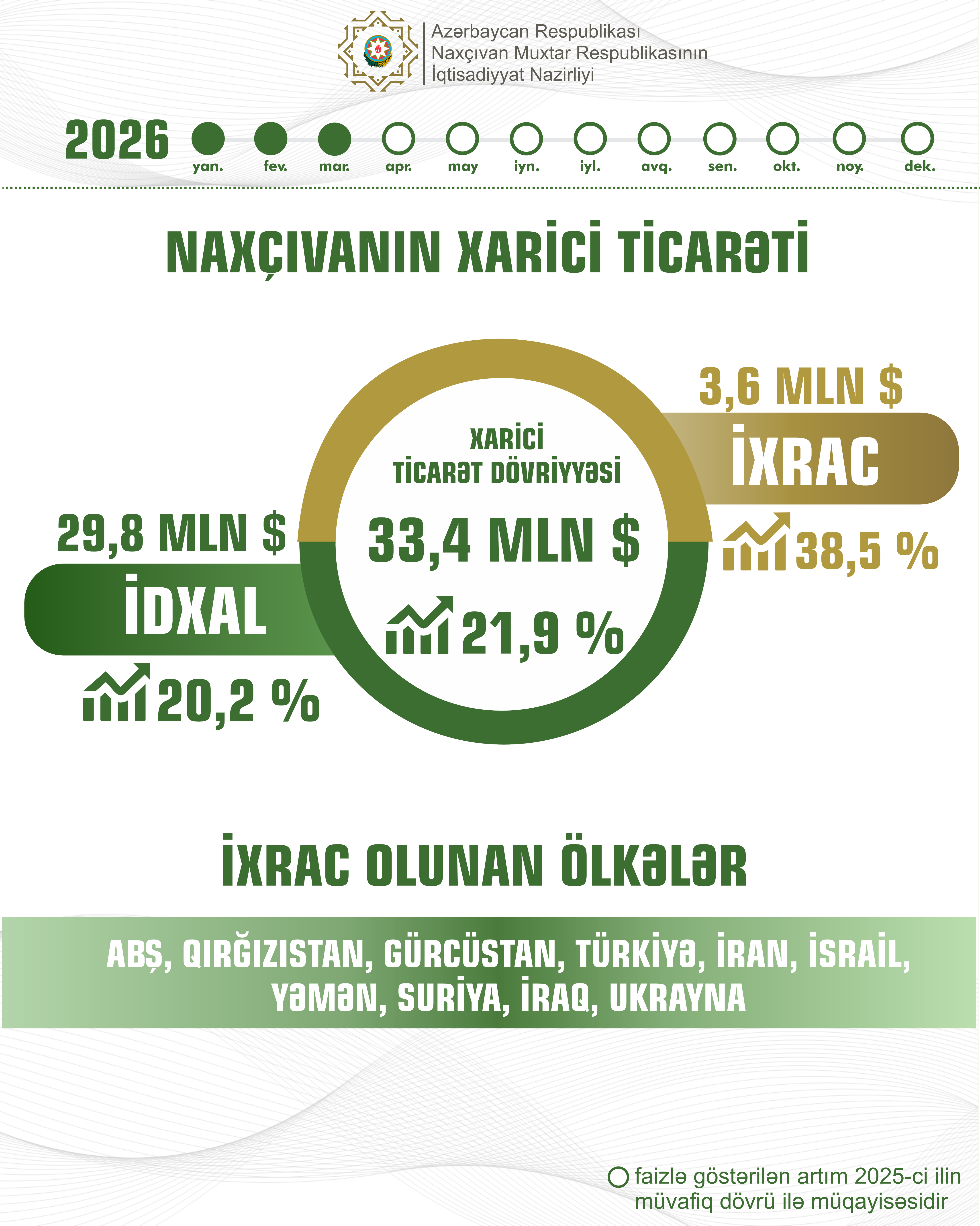 2026-cı ilin yanvar-mart aylarında muxtar respublikanın xarici ticarət dövriyyəsi 33,4 milyon ABŞ dolları təşkil edib ki, buda ötən ilin eyni dövrünə nisbətən 21,9 faiz çoxdur.