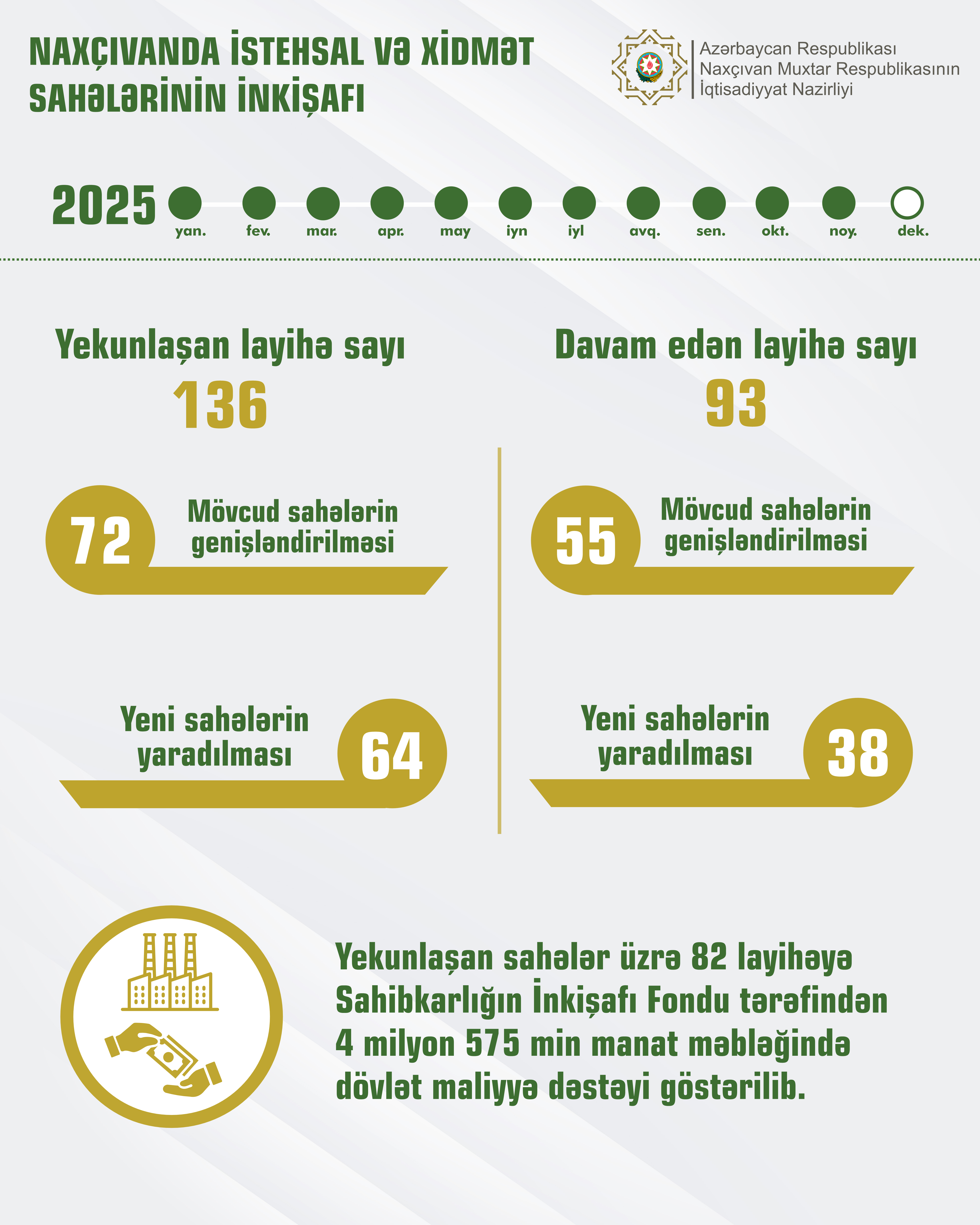 Naxçıvanda müxtəlif təyinatlı yeni istehsal və xidmət sahələri yaradılır, yaxud mövcud olanların fəaliyyəti bərpa edilir və ya genişləndirilir. 2025-ci ilin yanvar-noyabr ayları ərzində muxtar respublikada dövlət dəstəyi və özəl investisiya qoyuluşu hesabına iqtisadi fəaliyyətin müxtəlif sahələrində 136 layihə üzrə istehsal və xidmət sahələri yaradılıb. Yekunlaşan layihələrdən 64-ü yeni sahələrin yaradılması, 72-si isə mövcud sahələrin genişləndirilməsi məqsədi daşıyıb.