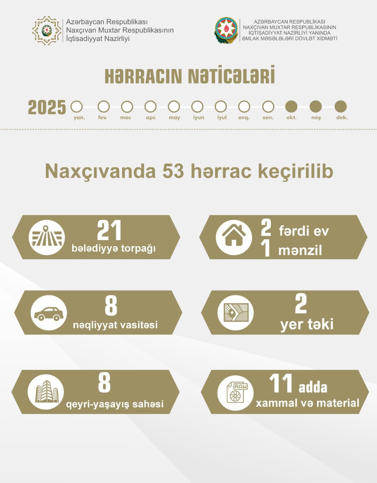 Bu ilin yanvar-sentyabr ayları ərzində Naxçıvan Muxtar Respublikasında keçirilən hərraclar şəffaflıq və rəqabət prinsipləri əsasında davam etdirilib. Naxçıvan Muxtar Respublikasının İqtisadiyyat Nazirliyi yanında Əmlak Məsələləri Dövlət Xidmətinin tabeliyində fəaliyyət göstərən “Hərracların Təşkili Mərkəzi” publik hüquqi şəxs tərəfindən cari ilin ilk doqquz ayında 53 hərrac təşkil olunub.