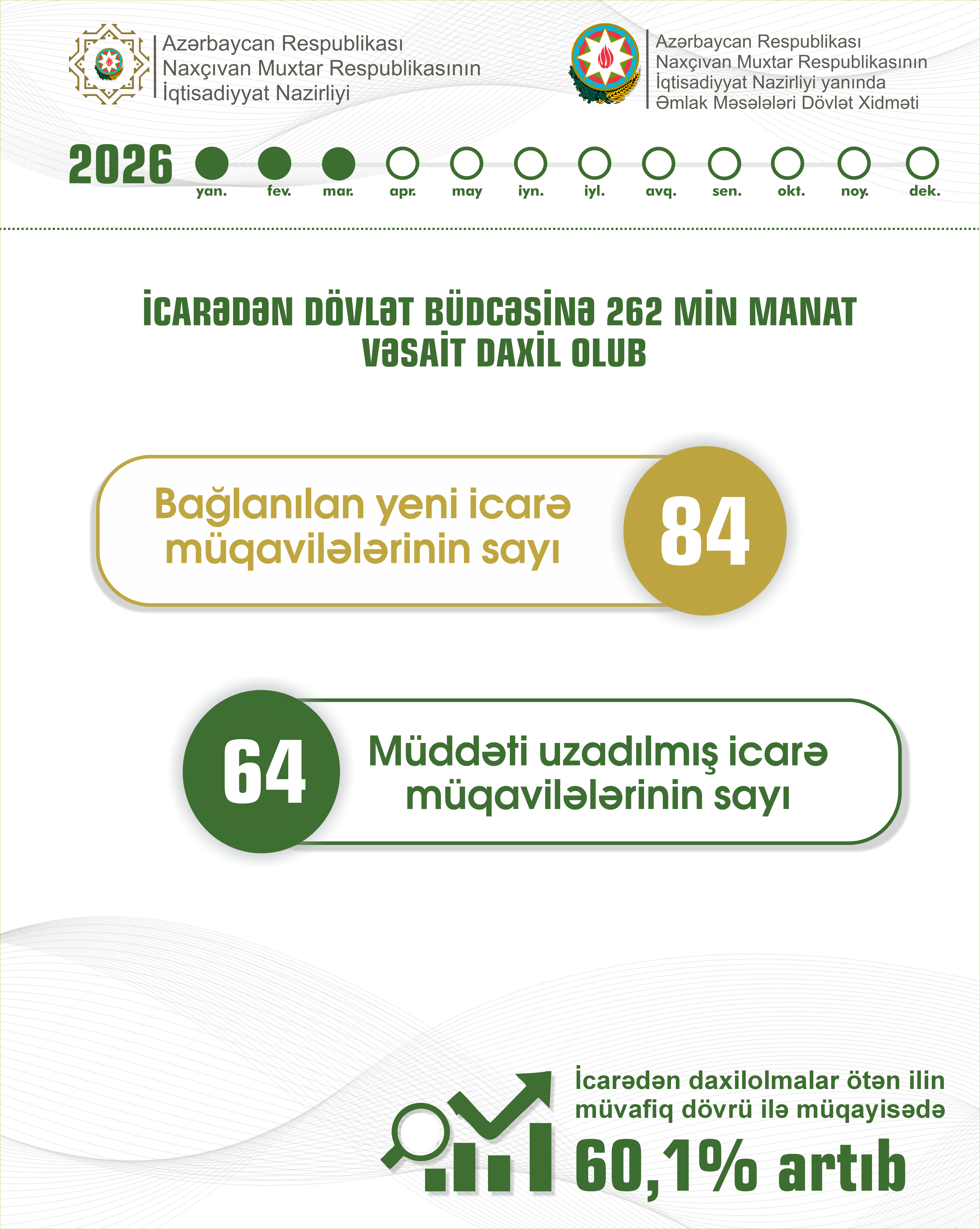 2026-cı ilin yanvar-mart aylarında Naxçıvan Muxtar Respublikasının İqtisadiyyat Nazirliyi yanında Əmlak Məsələləri Dövlət Xidməti tərəfindən 84 yeni icarə müqaviləsi bağlanılıb ki, bunlardan 57-si qeyri-yaşayış, 27-si isə torpaq sahələrinə dair olub. 64 müqavilənin isə müddəti uzadılıb.