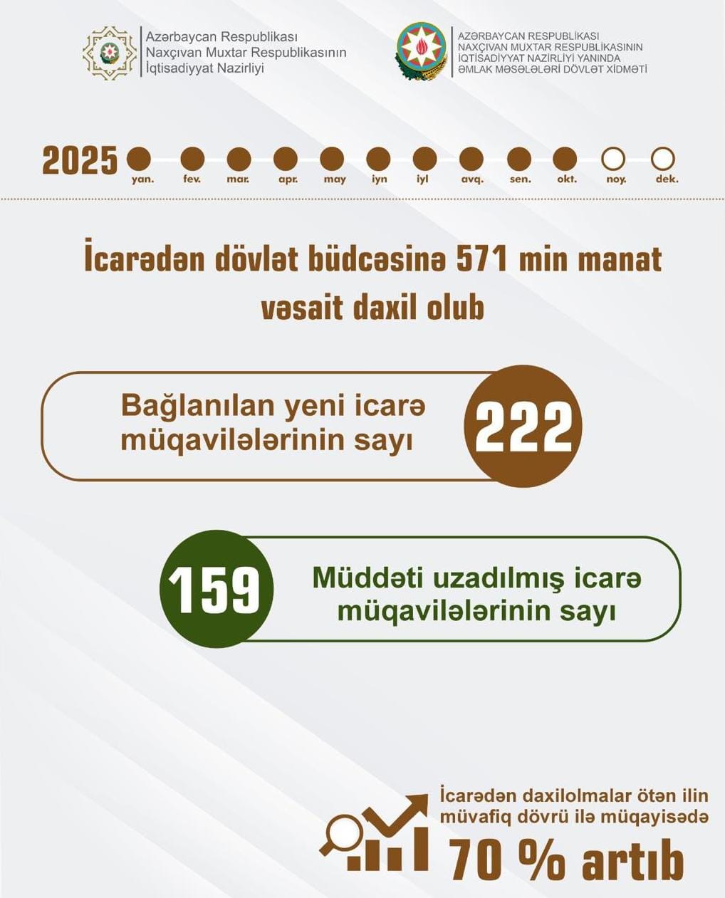 2025-ci ilin yanvar–oktyabr aylarında Naxçıvan Muxtar Respublikasında dövlət mülkiyyətində olan əmlakların icarəyə verilməsi sahəsində işlər davam etdirilib.