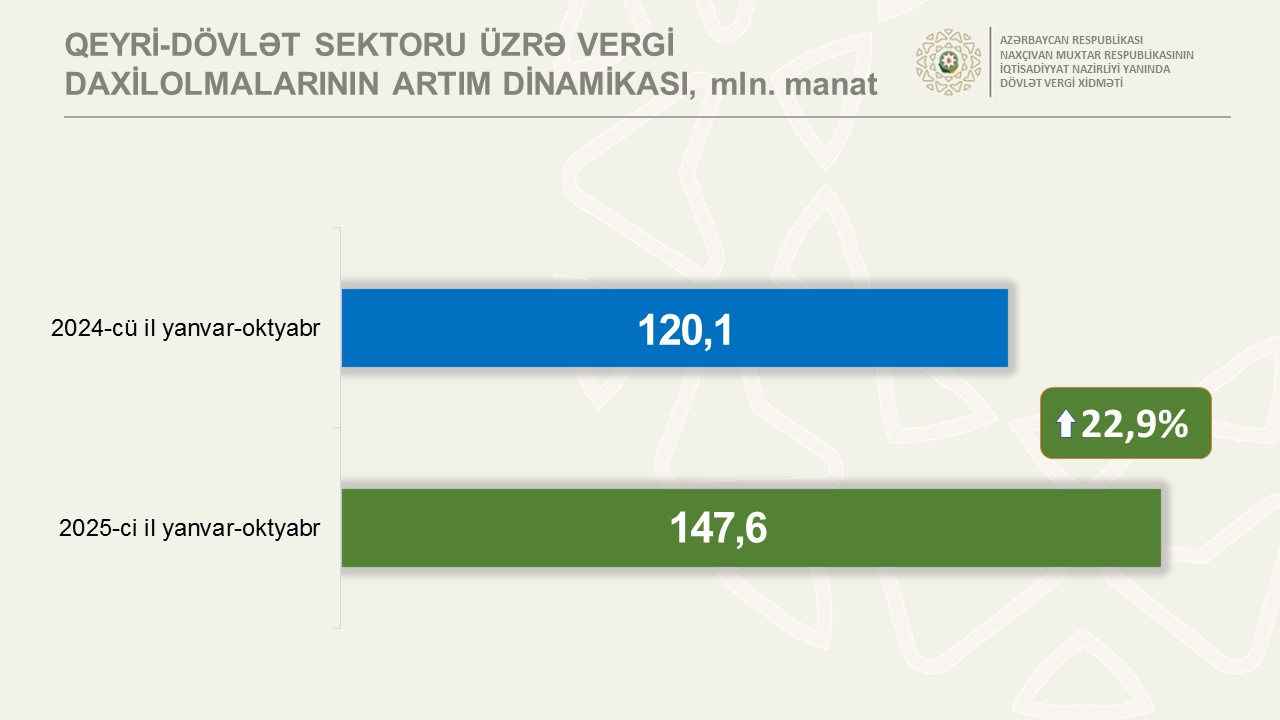Qeyri-dövlət sektorundan daxilolmalar 147,6 milyon manat təşkil edib. 2024-cü ilin müvafiq dövrü ilə müqayisədə bu sektordan vergi daxilolmaları 27,5 milyon manat və ya 22,9 faiz artıb. Ödənilən vergilərin 70,7 faizi qeyri-dövlət sektorunun, 29,3 faizi isə dövlət sektorunun payına düşüb.