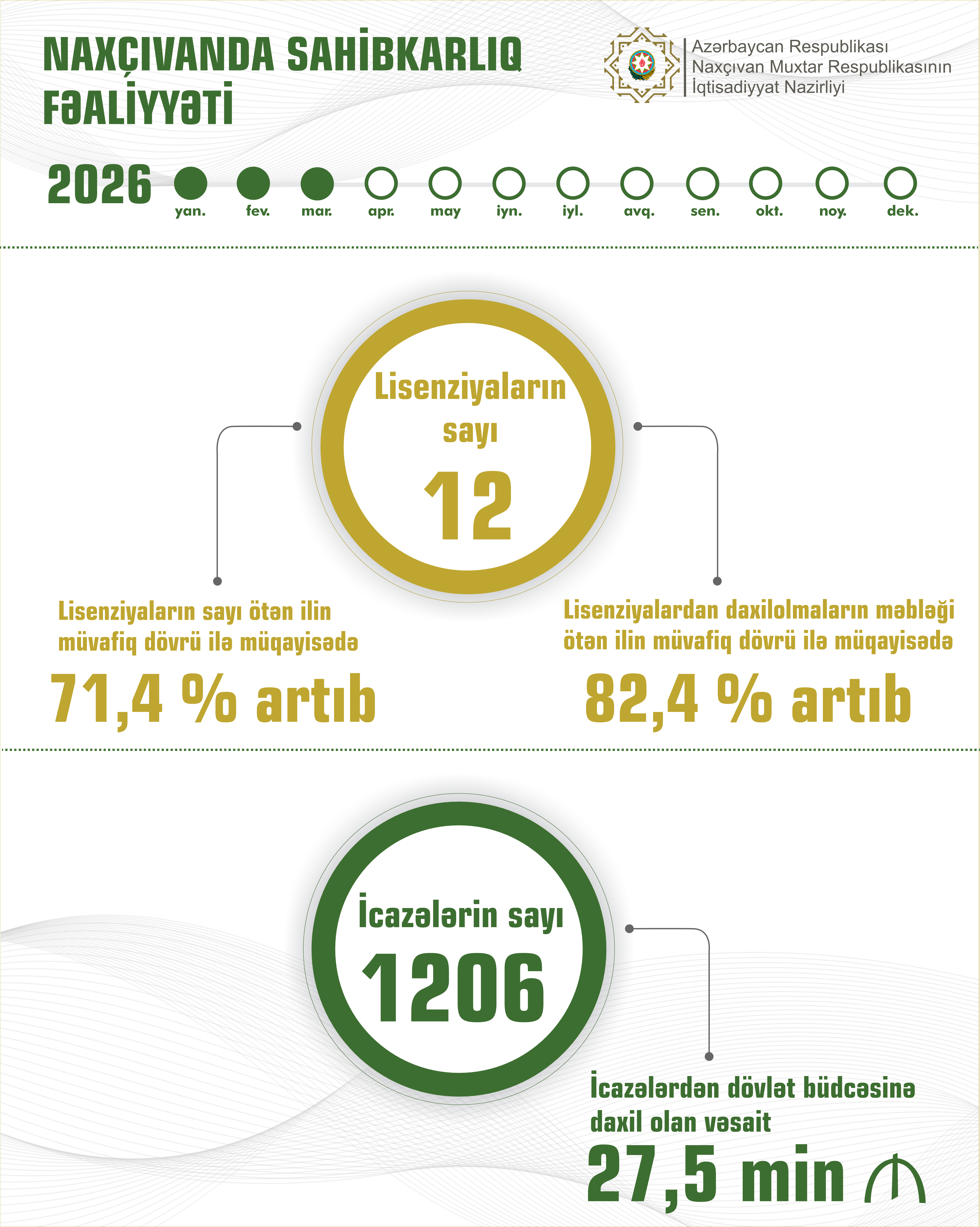Cari ilin 3 ayı ərzində Naxçıvan Muxtar Respublikasının müvafiq qurumlarının verdiyi 1206 icazə reyestrdə qeydiyyata alınıb, verilmiş icazələr əsasında dövlət büdcəsinə 27,5 min manat vəsait daxil olub.