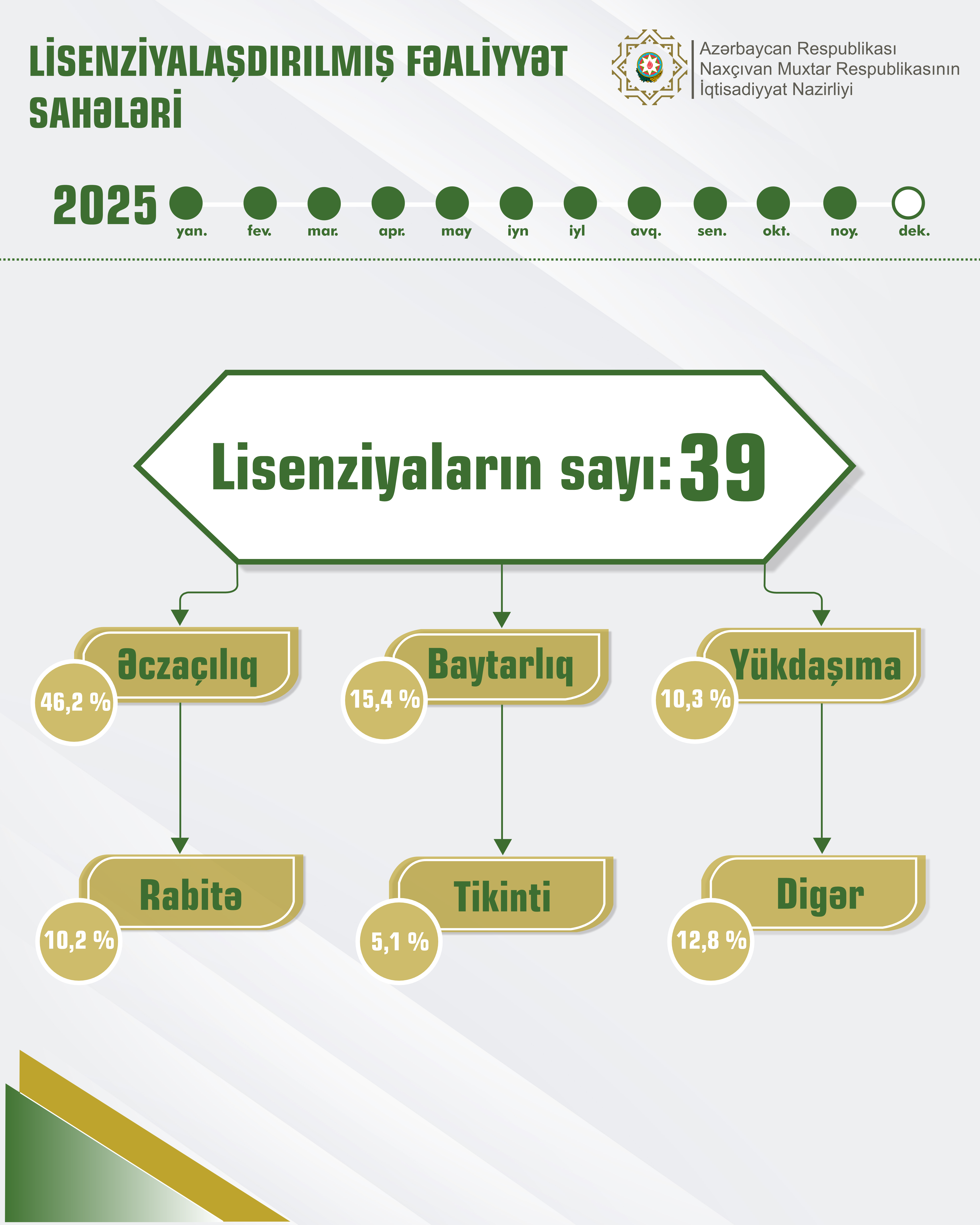 Cari ilin 11 ayı ərzində verilmiş lisenziyaların 46,2 faizini əczaçılıq, 15,4 faizini baytarlıq, 10,3 faizini yükdaşıma, 10,2 faizini rabitə, 5,1 faizini tikinti və 12,8 faizini digər fəaliyyət növləri təşkil edib.